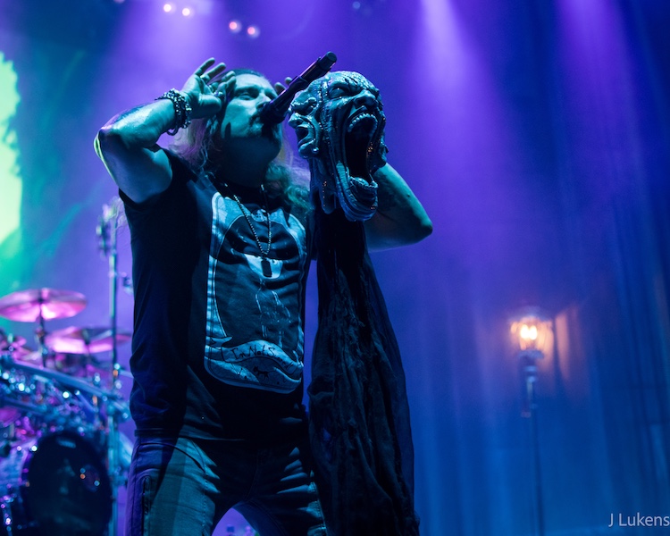 For the first act, Dream Theater played this year’s album, Parasomnia, in its entirety. To create the mood, the set was adorned with vintage street lights and a bed on an old metal bed frame, while nightmarish images played on the video screen behind the band. It was a night of virtuoso musicianship, as drummer Mike Portnoy laid down punishing polyrhythmic beats in constantly shifting time signatures, bassist John Myung backed him with supporting grooves, and Jordan Rudess added flourishes and solos on a keyboard set on a rotating and tilting stand. Guitarist John Petrucci showed off his fretboard mastery, alternating between beautiful arpeggios, histrionic solos, and jackhammer metal riffs. Singer James LaBrie belted out the vocals while gripping a microphone stand adorned with a skull and disappeared backstage during the long jam segments.